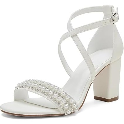 Women's open-toe pearl high-heeled sandals Chunky Buckle Ankle Strap Wedding Heeled Sandals Dress Evening Bride Shoes