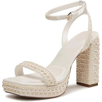 Womens Open Toe Pearl Platform Heels For Women Chunky Buckle Ankle Strap Wedding Heeled Sandals Dress Evening Bride Bridal Shoes