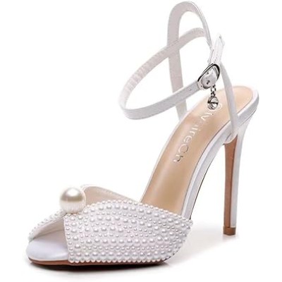 Womens Pearls Wedding Sandals Open Toe Stiletto 4" Heeled Sandals Bridal Pearl High Heels for Evening Party